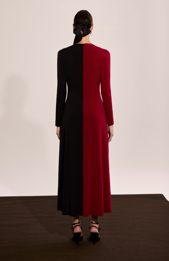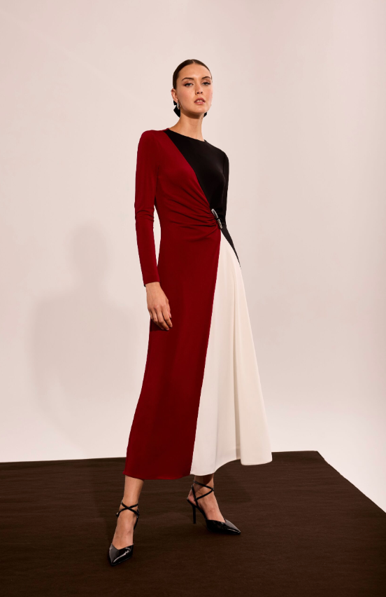 Vestido largo de diseño bicolor con silueta estilizada y drapeado lateral que realza la figura. Una pieza sofisticada y moderna, ideal para eventos formales y ocasiones especiales..
